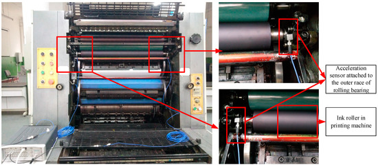 The experimental rig is shown in Figure 10b. The vibration signals were obtained with acceleration sensors. The acceleration used here is PCB 333B30 and serial number LW55675, with a sensitivity of 100 mV/g. In order to collect and calculate the data, LMS measurement system is used which contained a SCM202 chassis, the LMS-SCM-V8-E data acquisition card and an industrial computer Dell-M4800. In this experiment, the acceleration sensor was attached to the outer race of the bearing as shown in Figure 11. The bearing is used for the ink roller and is mounted on both ends. The accelerometer recorded the vibration in the normal direction of the outer ring. The sampling frequency is set to 50 kHz. The printing speed was set as 3600 per/hour and 7200 per/hour, and corresponding speeds of bearings were 4 rad/s and 8 rad/s, respectively, according to the rotation ratio.