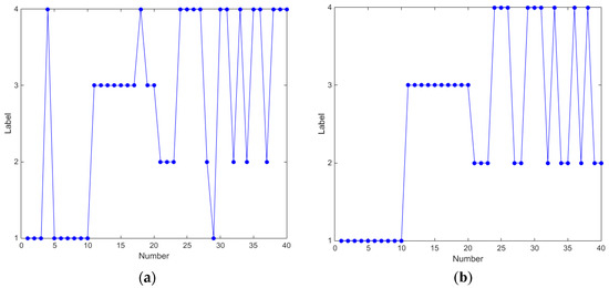 The result with K-means cluster is recorded in Table 6. In sample B, the accuracy rate is only 72.5% and 77.5%, and this is because it is hard to distinguish the normal samples under different speeds. In Sample A of Table 6, the normal samples under both 4 r/s and 8 r/s were treated as a whole sample; therefore, the accuracy rate can reach 95% and 100% with EMD and EWT. The cluster results are shown in Figure 13. Labels on the Y axis represent different samples and the Number axis represents the number of samples. No.1–No.10 are fault bearings in 4 r/s and No.11–No.20 is 8 r/s. No.21–No.30 are normal bearings in 4 r/s and No.31–No.40 is 8 r/s. EWT still shows a better result.