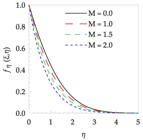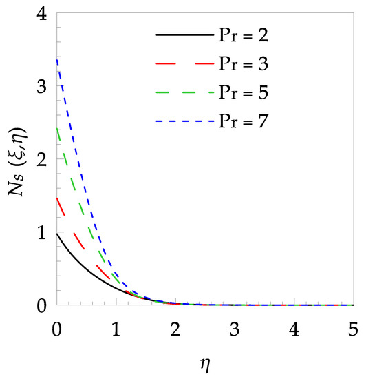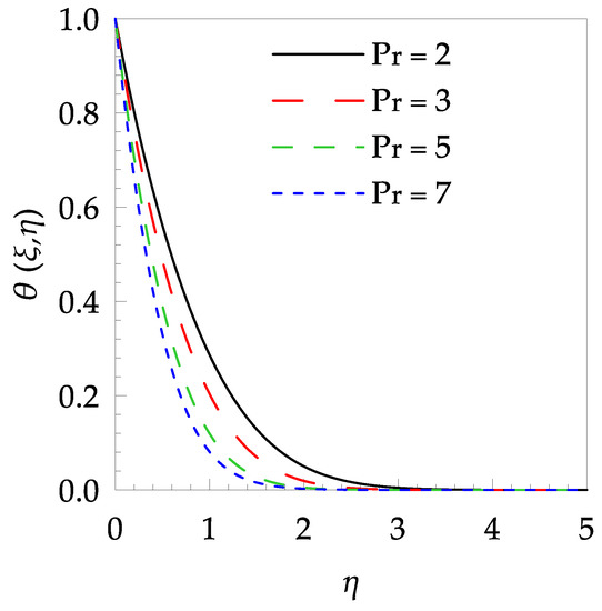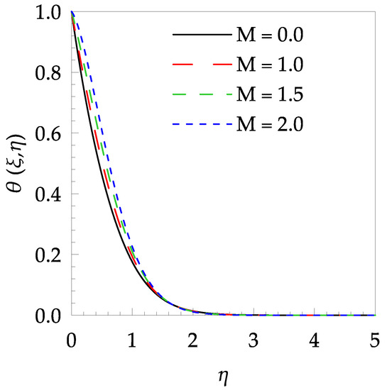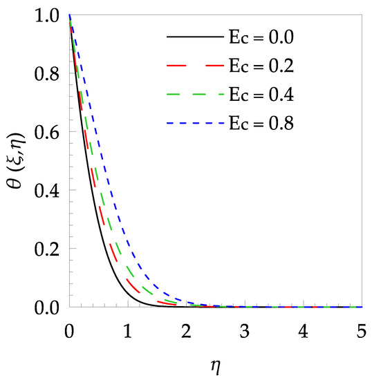Table 6 shows the effects of all physical parameters over the skin friction coefficient and Nusselt number for the unsteady flow. It is observed that both and decreases as time parameter increases. Skin friction coefficient increases; however, the Nusselt number decreases when increasing the Hartman number. Nusselt number increases for increasing values of Prandtl number, whereas the opposite behavior is seen for rising values of Eckert number. Figure 2 is sketched to see the variation of time parameter . As increases the velocity and momentum boundary layer thickness decrease. The impact of magnetic interaction parameter on the speed shape is observed in Figure 3. Boundary layer thickness and velocity decline as increases. Physically, the magnetic field is correlated with the electrically conducting fluid and creates a Lorentz force that is opposite to the direction of fluid flow; consequently, fluid velocity decreases. Figure 4 shows that temperature lessens by increasing . Figure 5 exhibits the impact of Prandtl number on temperature . It is clear that temperature dropped with increasing Prandtl number. When increasing the Prandtl number (decreasing the thermal conductivity of fluid), the heat flow rate from the stretching boundary trims down and consequently the thermal boundary layer descends. Growing decelerates the fluid flow; therefore, the friction between the fluid layers increases and generates frictional heating that raises the temperature (see Figure 6). The effect of Eckert number on the temperature is shown in Figure 7. As expected, temperature mounts with mounting values of . By increasing , the resistance sandwiched between the fluid adjoining layers increases and leads to a change of the kinetic energy into thermal energy. Furthermore, as increases, the width of the thermal boundary layer also increases. The influence of on is exposed in Figure 8. At the boundary and near to it entropy increases with . However, after reaching a maximum value a decreasing trend is observed. Figure 9 displays the effects of on entropy production number . It is found that the entropy creation number is a rising function of (due to high-temperature gradients) in the boundary layer flows. Figure 10 specifies the deviation of entropy creation number with dimensionless temperature . It is observed that entropy decreases with increasing values of . Hence, one can attain the main goal, that is, entropy creation minimization by reducing the working temperature disparity . Figure 11 specifies that entropy near the surface increases with but after a certain entropy decreases . Figure 12 represents the effect of on entropy production number and increasing behavior is observed. Figure 13 demonstrates the impacts of on . The figure shows that decreases with an increase in . The impact of Prandtl on Bejan number is illustrated in Figure 14. With a large Prandtl number Bejan number decreases. Figure 15 and Figure 16, shows that declines when raising the dimensionless temperature difference and Hartmann number , respectively. Figure 17 portrays the for different values of . Note that for , entropy creation is only due to heat transport. As the Eckert number is inversely proportional to the temperature difference, for high temperature dissimilarity between the surface and the ambient fluid, the viscous dissipation parameter becomes zero . Therefore, the heat transfer irreversibility in the entire flow region is completely dominant, i.e., .