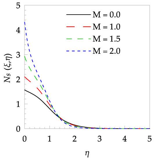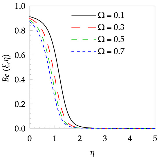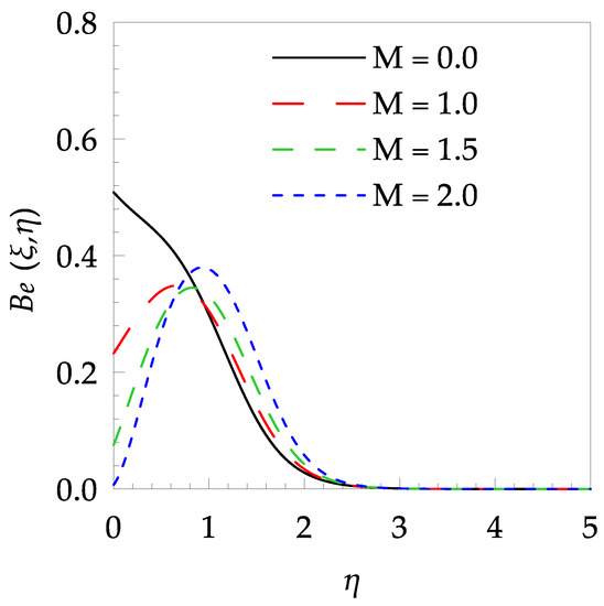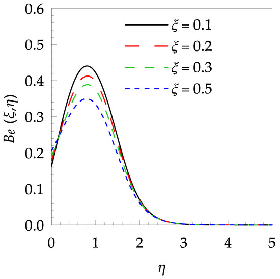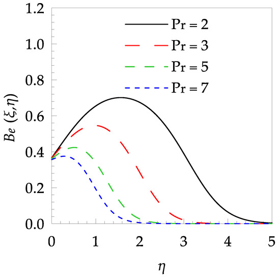 From the definition of the Bejan number , it is obvious that is always comprised between 0 and 1. The zero value of implies that the combined contribution of fluid friction and magnetic field completely overrides the heat transfer effect, while the unit value of indicates that the heat transfer mechanism is the only cause of entropy creation. On the contrary, it is found that the heat transfer and the combined effects of magnetic field and viscous dissipation can make an equal entropic contribution in cases where .