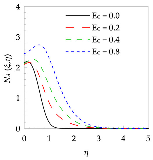 Entropy generation number , enhances with magnetic parameter, Prandtl and Eckert number. Reduction in is observed with rising values of .