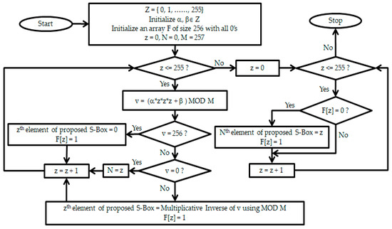 where, Z = {0, 1, ……, 2n − 1}, both α and β are not 0 at the same time, and α(z)3 + β ≠ 0 is used to construct the n × n S-box. The nonlinear nature of CFT stimulates its usage in byte substitution. The procedure to generate the proposed S-Box for n = 8 is illustrated in Figure 1.
