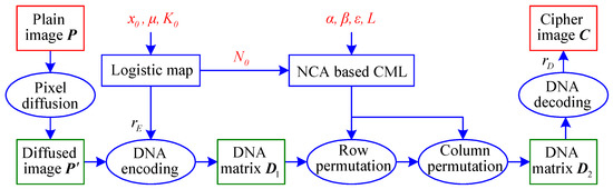 Block diagram of the image encryption algorithm based on DNA encoding and spatiotemporal chaos (IEA-DESC).