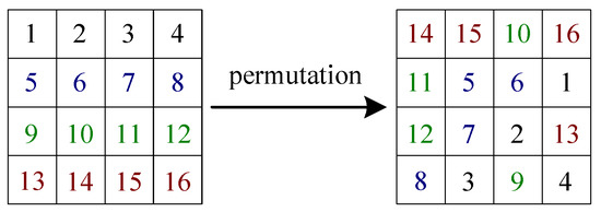 Supposing that one has an input matrix of size which satisfies that each element is unequal, and its corresponding one-dimensional sequence in the raster scanning order is . Letting denote a set , one has . Obviously, after a position permutation, the output matrix corresponding to the input matrix also has the feature that all elements are not equal to each other. According to the assumption of the chosen-plaintext attack in Table 2, one can know both and . Thus, the equivalent secret key can be determined by comparing the elements before and after the permutation.