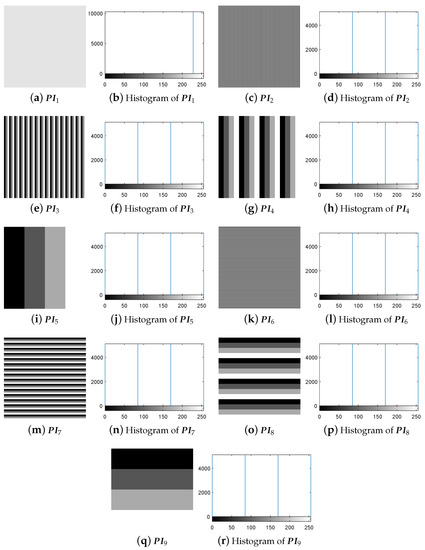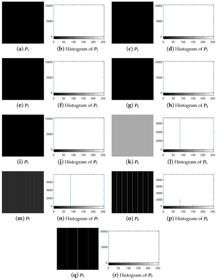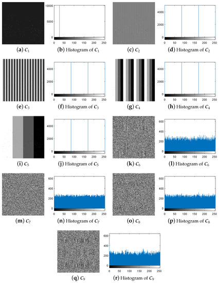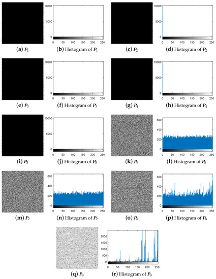 The experiment for breaking IEA-DESC was firstly carried out by the chosen-plaintext attack method proposed in Section 3.3. Given and , one gets = = 9 from Equation (10). Correspondingly, the nine 8-bit images constructed using the method in Section 3.2 are shown in Figure 5a–r.