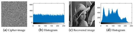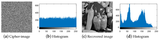 First, following Step 1 in Section 3.3, the nine special images shown in Figure 5 are selected as the diffused images , respectively, and then their corresponding plain-images are obtained, as shown in Figure 6a–r. Then, according to Step 2 in Section 3.3, the nine corresponding cipher-images and their histograms are obtained as shown in Figure 7a–r. Next, using the method in Step 3 in Section 3.3, the equivalent secret key is obtained using the nine chosen diffused images shown in Figure 5a–r and the nine corresponding cipher-images shown in Figure 7a–r. Finally, the images are recovered using the equivalent secret key . The attacking results on IEA-DESC with the 8-bit images “Lenna” and “Peppers” are shown in Figure 8a–d and Figure 9a–d, respectively.