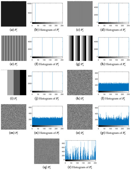 First, following Step 1 in Section 3.4, the nine special images shown in Figure 5 are used as the cipher-images respectively, and then their corresponding plain-images are obtained, as shown in Figure 10a–r. Then, according to Step 2 in Section 3.4, the nine corresponding diffused images and their histograms are obtained as shown in Figure 11a–r, respectively. Next, using the method in Step 3 in Section 3.4, the equivalent secret key is obtained using the nine chosen cipher-images shown in Figure 5a–r and the nine corresponding diffused images shown in Figure 11a–r. Finally, the images are recovered using the equivalent secret key . The attacking results on IEA-DESC with the 8-bit images “Lenna” and “Peppers” are also shown in Figure 8a–d and Figure 9a–d, respectively.
