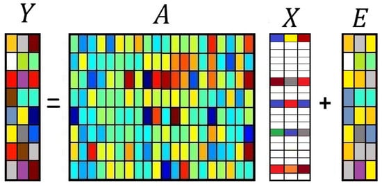 Single and multiple measurement vector (SMV and MMV) problems are computational inverse problems in the compressive sensing (CS) area. CS provides the possibility of representing a sparse or compressible signal using a small set of non-adaptive linear measurements [,]. In linear CS, the P-dimensional signal is modeled by the linear equation , where is the measurement vector (with ) and is a wide sensing matrix. The sensing matrix is usually constructed from a Gaussian or Bernoulli random operator. In [], it was shown that also can be constructed from a class of circulant matrices based on deterministic sequences such as the Golay sequence []. In the CS context, it is further assumed that is sparse under some proper basis , i.e., , where denotes a sparse vector. A sparse vector contains few non-zero components. Combining the two above equations, we obtain , where []. Since A is wide, the model is underdetermined, and CS looks for a sparse (if not the most sparse) solution such that [,]. The SMV is a CS problem when A is known and the measurements are contaminated with noise , i.e., . The case where Y and are matrices is called the MMV problem, i.e., . In the basic MMV model, it is assumed that all the columns of the solution matrix share joint sparsity, meaning that they have the same unknown non-zero locations. Figure 1 shows an example of the MMV structure.