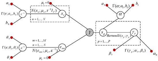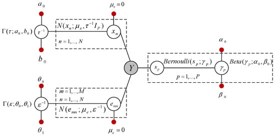 The shaded node Y shows the observations, and the small solid nodes represent the hyperparameters. Each unshaded node denotes a random variable (or a group of random variables) []. The support-learning component in (1) is a binary vector, and we model the elements of as Bernoulli random variables, whose probabilities are governed by the prior ; that is,