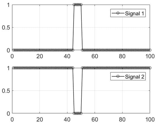 According to Figure 3, both signals have the same measure of . As we can see in this figure, Signal 1 is sparse, while Signal 2 is non-sparse. Therefore, the measure of total variation is not sufficient to promote sparse clustered pattern solutions. Let us also investigate how the measure of total variation is affected by forcing a specific component in these two signals, active and inactive. The original active locations of Signal 1 are 45:50 (with MATLAB notation). Now, if we set the 44th component in Signal 1 to become active, the measure of total variation does not change. Similarly, setting the 44th component on Signal 2 to zero does not change the measure of total variation. This suggests that we need to further modify our model to promote sparsity, as well. For this purpose, we incorporate a binomial distribution into our prior model for . This distribution contains the effect of the sparsifying hyperprior and the sum over all the support components of the support vector (for both active and inactive status of ). Referring back to the example illustrated in Figure 3, for Signal 1, the sum over the supports of the signal (the number of active components) is six, while this measure is 94 for Signal 2. Therefore, the solution with the lower value of summation over the supports is sparser and of more interest.