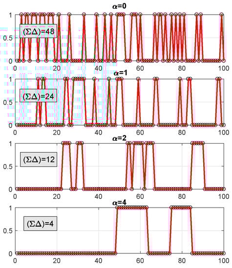 There exist fewer transitions in , corresponding to a smaller , when the supports of the solution have a clustered pattern compared to an unstructured distribution of supports. The measure is used to establish a prior probability, which encourages clustered pattern supports by setting the prior for the support-learning vector proportional to for some . The parameter specifies the significance of the clumpiness in the supports. Large values of encourage more contiguity in the supports of . However, the measure of (total variation on the support vector) itself is not sufficient to promote sparse clustered pattern supports, but rather only promotes clustered pattern solutions. Here, we provide a motivational example to clarify the reasoning for this. In Figure 3, we have two signals (one sparse and the other non-sparse), where both signals are of length 100.