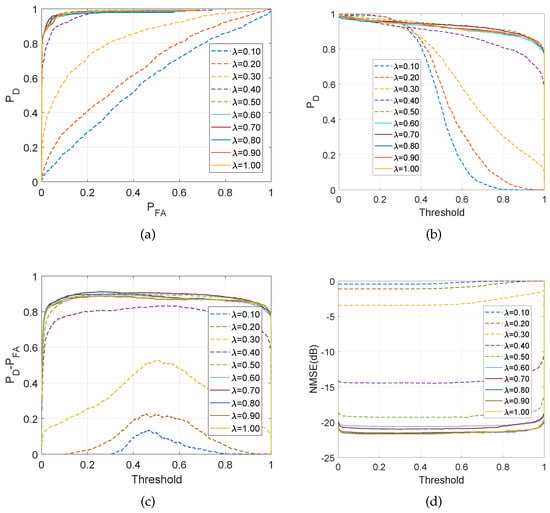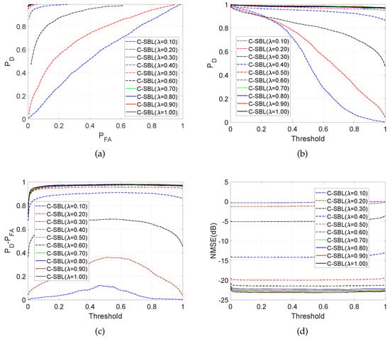 Aspects of performance of the proposed C-SBL algorithm for the SMV problem. (a) Empirical ROC; (b) Detection rate; (c) ; (d) NMSE (dB).