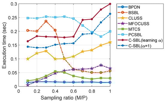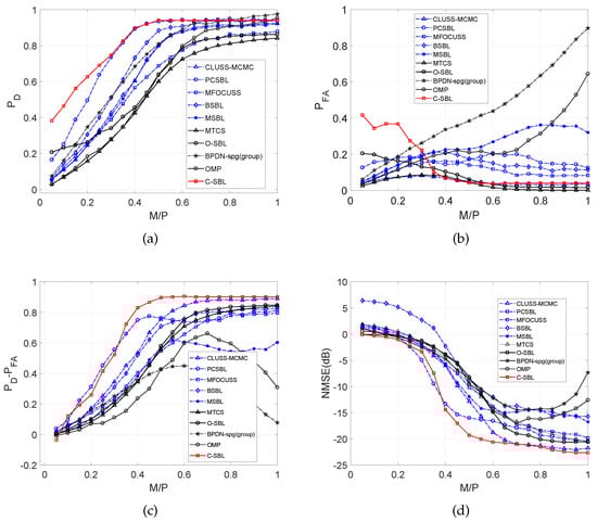 We now compare the performance of C-SBL and O-SBL with other algorithms, specifically: CLUSS-MCMC algorithm for solving clustered structure compressive sensing using Markov chain Monte Carlo method [], orthogonal matching pursuit (OMP) algorithm [,], MMV focal underdetermined system solver (MFOCUSS) [], block-sparse Bayesian learning algorithm (BSBL) [,], MMV sparse Bayesian learning algorithm (MSBL) [], basis pursuit denoising algorithm for group sparsity (BPDN-group) using the spectral projected gradient for minimization (SPGL1) solver [], the single-task version of multi-task compressive sensing algorithm (MTCS) [,], and PC-SBL [,]. In all of the algorithms, we discarded those estimated elements in the solution with an amplitude less than from the support set. In Figure 7a–d, the results for the O-SBL and C-SBL algorithms are based on the sample mean of the collected samples.