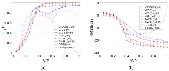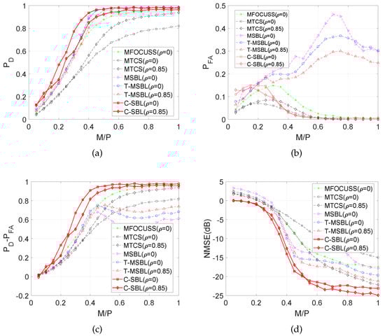 Figure 7a shows that C-SBL provides the best performance in terms of detecting the true supports of the solution. In Figure 7b, the false alarm rate in support recovery is illustrated, where we see that for , our algorithm has a higher false alarm rate in support recovery at the cost of providing a higher detection rate within the same range for . In contrast, the rates for C-SBL, O-SBL, CLUSS-MCMC, and MTCS become almost the same and have the lowest values.