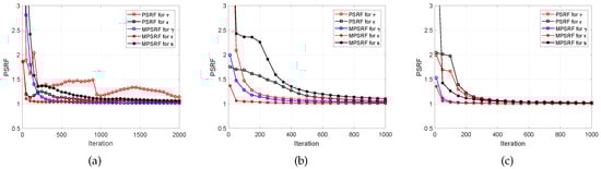 Computing the MSPRF for needed some modifications. The estimated posterior variance of is assessed based on the mixture of all the simulated sequences divided by the average of the variances within each sequence []. The main issue with the MPSRF for occurred in our simulations when computing . In fact, this matrix became ill-conditioned, and the issue was with the fact that sequences on were either zero or one. We dealt with this issue by adding random draws from a zero-mean Gaussian with the variance of to the samples of and then measured the MPSRF.