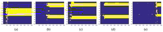 Examples showing samples of the support learning vector . The vertical axis shows the elements of , and the horizontal axis represents the iterations. (a) Example 1; (b) Example 2; (c) Example 3; (d) Example 4; (e) Example 5.