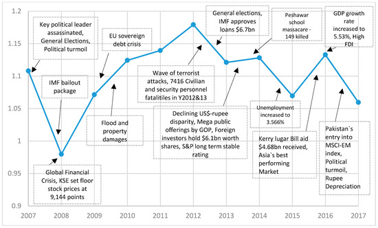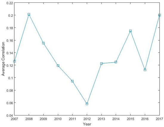 Figure 13 shows the time-varying result of a normalized tree length of the Pakistan stock market network. As can be seen, the lowest NTL curve during a GFC is observed for the PSX network in the year 2008 and implies a higher correlation among stocks. However, after getting a financial assistance package from the International monetary fund (IMF) to curb the GFC in the year 2008, the NTL curve shows a gradual increase and recovery that leads to expansion thereafter. In addition, the EU sovereign debt crisis appears to have no significant impact on the PSX network, and so, it is the flood and resultant property damages that affected 14 million people in the year 2010 [68]. To sum up, the results show that the crisis-related shocks of terrorism, politics, and economics resulted in the shrinkage of the PSX network.