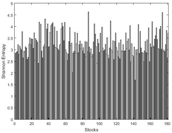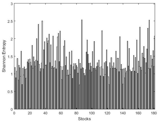 where is described as 0 and the normalized related probabilities is . The base 2 for is drawn so that the computation is given concerning bits of information. We divide the log return of the stock into different bins and then compute the probabilities of each state divided by the total number of values of stock . We then apply the Shannon entropy depending upon the number of selected bins for each stock to measure the uncertainty and volatility (for a detailed study, please see Reference [51]).