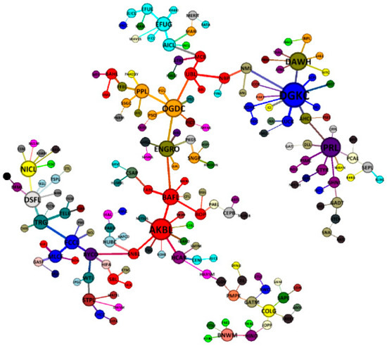 Figure 7 presents the overall MST structure of the Pakistan stock market. As can be seen, the whole structure of PSX network revolves around one super hub node of DG khan company having 42 connections, followed by the important nodes of Nishat mills (NML 12), Fauji cement company (FCCL 7), and Pakistan state oil (PSO 7). Hence, the rise and fall of DGKC will give a huge impact on the stability structure of the PSX network, as mentioned by Sharif et al. [60] for the HWAN and MRES nodes of the Malaysian stock market network. The results also reveal a star-like less stable market structure of PSX during the entire period of study, similar to the structures of the Vietnamese stock exchange [40] and German stock exchange [61] during crises. The crisis-like structure is well-suited, given the turbulent timeline of 11 years for Pakistan that posed various challenges and threats, among the major being GFC, terrorism, and economic and political crisis. Furthermore, the results show a substantial clustering on the Pakistan stock exchange network because stocks mostly tend to cluster based on their economic activity.