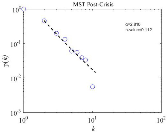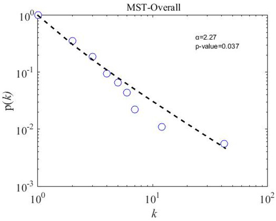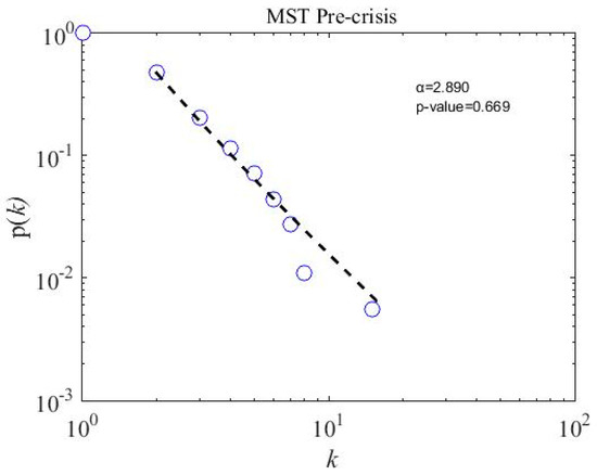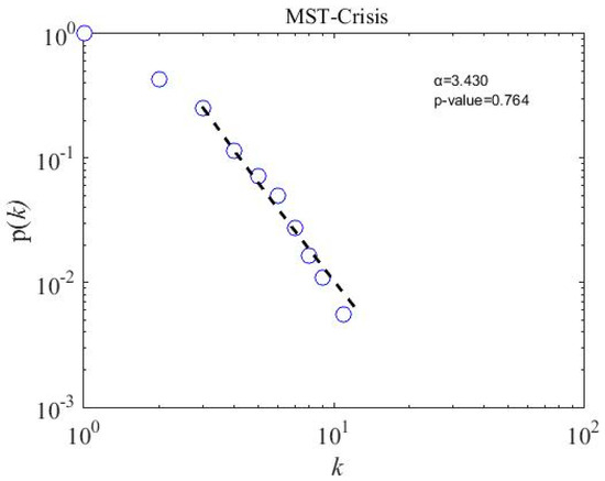 We calculate the scale-free properties of the MST networks, a concept introduced by Barabasi and Albert in the year 1999 [62] and widely used in financial network literature [20,22,63,64]. The power-law degree distribution of node and degree has a power tail, such as ; the network is said to be scale-free. We apply a powerful tool introduced by Clauset et al. [65] to observe the degree distribution of subsamples and overall MST networks. To accept the power-law hypothesis, the goodness-of-fit -value must be larger than 0.1 [65]. The fitting results for three subsample periods are presented in Figure 8, Figure 9 and Figure 10. The -value for three subsamples is larger than 0.1, which means that the degree distribution follows the power law. However, the -value of the overall sample period stands at 0.037, shown in Figure 11, which implies not to accept the power-law hypothesis. Similarly, a star-like MST is also found by Nguyen et al. [40] for the Vietnamese stock market from the year 2011 to 2012, where the degree distribution does not fit with the power law distribution. In addition, the power-law exponent (the value of the power-law exponent α nearing 1.0 indicates the longer tail distribution) for the crisis period is 3.430, which is higher than in the precrisis, , and postcrisis, , periods. Hence, a postcrisis degree distribution of MST has a longer tail distribution in comparison with the precrisis and crisis period MST networks. As can be seen in Figure 8, Figure 9 and Figure 10, the degree distribution of the postcrisis period is more compact than the pre- and crisis period.