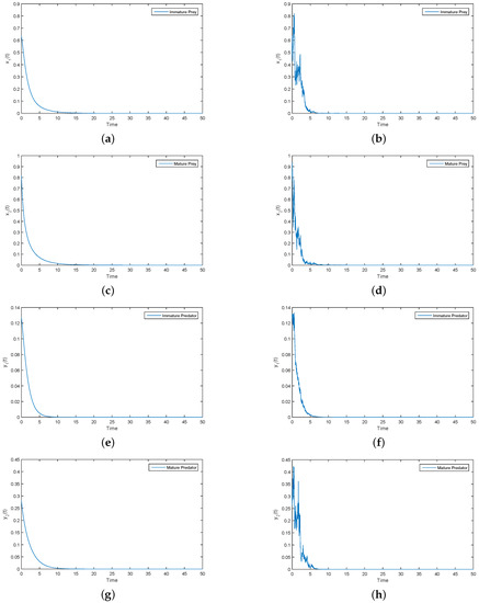 (a,c,e,g) Solutions of , , and for deterministic System (2), respectively; (b,d,f,h) solutions of , , and for perturbation System (3), respectively.