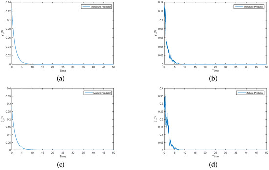 (a,c) Solutions of immature and mature predator population for deterministic System (2), respectively; (b,d) solutions of immature and mature predator of perturbation System (3), respectively.