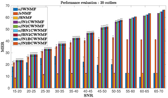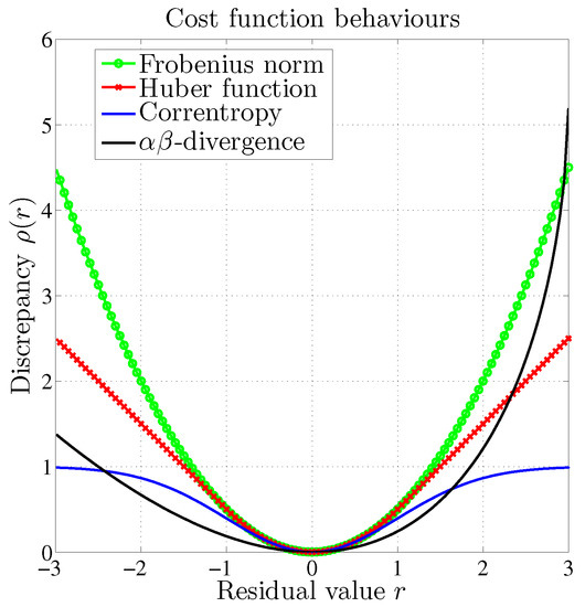 Solving Equation (1) can be performed by appropriately choosing a discrepancy measure between X and . When this measure is the Frobenius norm of their difference, the possible presence of a few outliers may corrupt the NMF enhancement. As a consequence, robust NMF methods were proposed to deal with a predefined number of outliers. While some of them decompose the data matrix into the sum of a low-rank and a sparse matrix—where the latter contains the outlying component [18]—most ones consider some modified cost functions as dissimilarity measures which gave rise to flexible and robust algorithms, e.g., Bregman-NMF [19], -NMF [20], -NMF [21,22], -NMF [23], Correntropy-NMF [24], Huber-NMF [25] (it should be noticed that the Huber cost function has also been considered for robust PMF [26]).
