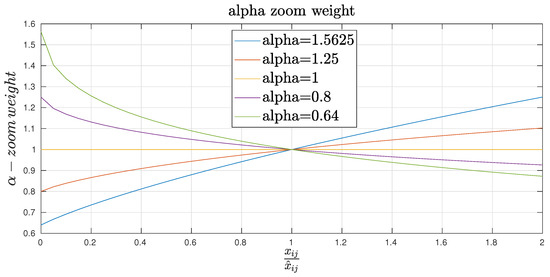 Equation (8) combines two effects, namely an -zoom and an weight effect. When , the emphasis of the -zoom is put on larger values of the ratio while the emphasis is put on smaller values of this ratio when . These properties are recalled in Table 1. The weight effect in is expressed as a function of in Table 2.