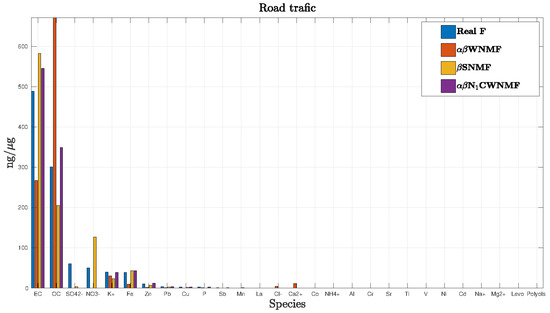 As a consequence, we investigated the enhancement provided by informed NMF. In Ref. [31], the use of a Gaussian plume model enables us to assess the presence or absence of some punctual sources, depending on wind measures, and source and sensor locations which allowed us to fix some entries of G to zero. In the absence of a punctual source, such an information should be dropped. In Ref. [32], an informed NMF-based weighted criterion takes into consideration the known values of some terms of F (Informed NMF has also been proposed in [33] where the known entries are seen as a penalization term in the NMF optimization problem) in order to improve the separation. For that purpose, we introduced a specific parameterization for NMF methods using a Frobenius norm. This approach should be considered as a flexible NMF counterpart of [34] in between blind source separation—where no information on F is provided—and regression, where F is fully known. While it was shown in practice to be less sensitive than blind NMF to convergence issues, this method can still be affected by outliers which are present in many receptor modeling problems.