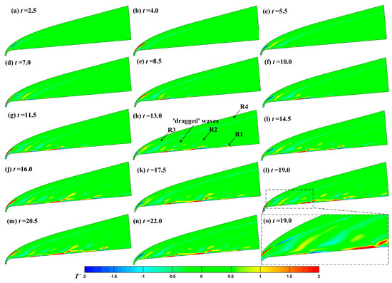 We wanted to accurately analyze the influence of roughness elements on hypersonic boundary layer receptivity under different types of disturbance. Firstly, the hypersonic flow field on the smooth wall was numerically simulated to determine the formation and evolution of disturbances in the hypersonic flow field and boundary layer under different types of disturbance. The effect of fast waves on the hypersonic flow field and boundary layer was used as an example to observe the response process of the hypersonic flow field to free-stream disturbances. Figure 2 shows the evolution of the temperature fluctuations in a hypersonic flow field under fast waves. Again, the physical quantities in this paper are dimensionless. Figure 2 shows that the fast waves pass through the shock and disturbances form and evolve in the flow field, boundary layer, and downstream. When t = 15, the free-stream disturbances totally passed through the flow field, so when t > 15, the response of the hypersonic flow field and boundary layer to free-stream disturbances is periodic. The unsteady hypersonic flow field can be simply divided into four regions as shown in Figure 2h. The first region is the boundary layer region, which is labelled region R1. The fast waves enter the boundary layer after passing through the shock and excite perturbations in the boundary layer. The perturbations result in a high-temperature spot and a low-temperature spot in the boundary layer during the process of propagating downstream. The R2 region is between the boundary layer and the shock. The fast waves enter the flow field through the shock and dragged waves form, as shown in Figure 2h. The amplitude of the disturbances in this region is obviously lower than that in the boundary layer. The disturbances in the flow field interact with the perturbations in the boundary layer, and the disturbances at the boundary layer edge no longer present a high-temperature spot and a low-temperature spot in sequence. The R3 region is the shock region. The shock deforms obviously, and the amplitude of the disturbances changes most obviously with the normal shock. With the decrease of shock intensity, the amplitude of the disturbances decreases significantly. The R4 region is the outer region of the shock. Fast waves enter the flow field from the upper boundary of the computational domain until they interact with the shock.