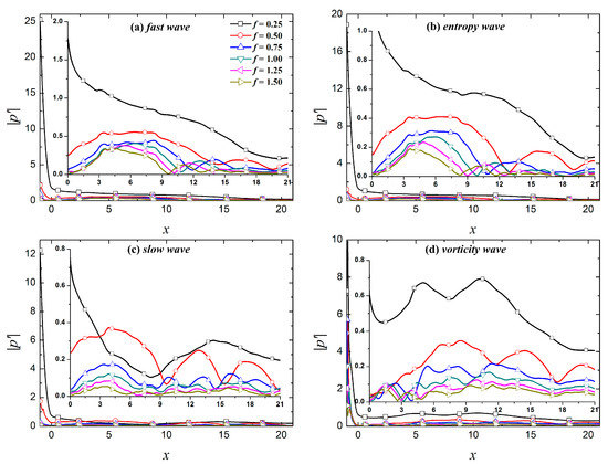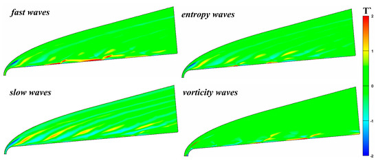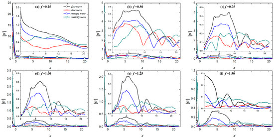 In Figure 8, in the upstream region (x < 10) of the calculation domain, the fundamental mode and harmonic modes (except the sixth harmonic mode in the region of 8.90 < x < 10.26) in the boundary layer caused by fast waves are stronger than the other three free-stream disturbances. In the downstream region of the calculation domain, the perturbations in the boundary layer caused the vortical waves are larger than the other three disturbances. The amplitude of the perturbations in the boundary layer caused by slow waves is relatively small within the calculation domain, especially for perturbations with f > 0.75. In general, the fast waves result in large amplitude fundamental and harmonic modes in the boundary layer in the response phase; their amplitudes gradually decrease in the process of downstream evolution. This is similar to the simulation results reported by Cerminara et al. [37]. They stated that this occurs because the fast waves resonate with the boundary layer when passing through the shock (especially a normal shock), resulting in a significant increase in the amplitude of the perturbations in the boundary layer. The initial amplitude of the perturbations caused by vortical waves is small after entering the boundary layer. As the perturbations in the boundary layer evolve downstream, the amplitude of the fundamental and harmonic modes is gradually larger than the amplitude of the perturbations in the boundary layer under the other three free-stream disturbances. The amplitude of the perturbations in the boundary layer caused by slow waves is relatively small throughout the whole calculation domain because the propagation speed of the perturbations in the boundary layer increases when the perturbations enter the boundary layer. The resonance of the perturbations in the boundary layer caused by slow waves is relatively weak in the nose region, resulting in the initial amplitude of the perturbations in the boundary layer being relatively small. As perturbations evolve downstream, the amplitude of the fundamental and harmonic modes is always small or even the smallest observed.