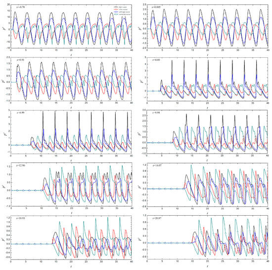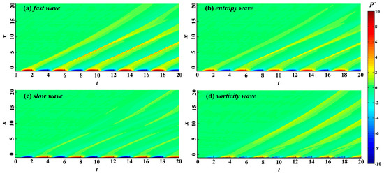 To better compare the difference in the propagation of the perturbations in the boundary layer caused by different types of free-stream disturbance in the time domain, Figure 5 shows the propagation process of the pressure fluctuation at different positions in the boundary layer in the time domain under free-stream disturbances. The boundary layer experiences free-stream disturbances later in the more downstream region. In the nose region, the waveform of the perturbations is closer to free-stream, and the amplitude of the perturbations in this region is significantly larger than that in the downstream region, even an order of magnitude higher than the perturbations at some locations in the downstream region. From the nose region to x = 9.98, the amplitude of the perturbations in the boundary layer caused by fast waves is the largest. In the region of x = 9.98–20.87, the amplitude of the perturbations in the boundary layer caused by vortical waves are the largest. In the time domain, the response process of the boundary layer to free-stream disturbances can be divided into two stages. In the first stage, free-stream disturbances interact with the boundary layer, resulting in the generation of perturbations in the boundary layer. This is called the response phase. There are some differences in the response time of different types of disturbances at different positions in the response phase. The second stage involves periodic pressure fluctuations in the boundary layer, which is called the periodic phase. The magnitude relationship between the amplitude of the perturbations in the response phase and in the periodic phase is affected by the type of the disturbances and their locations. At x = 4.00, the amplitude of the perturbations in the boundary layer caused by fast waves is significantly smaller in the response phase than in the periodic phase, and this phenomenon remains until x = 12.96. For fast waves, the amplitude of the perturbations in the boundary layer in the response phase is smaller than that in the periodic phase, except at x = 18.937. The amplitude of the perturbations in the boundary layer caused by the entropy waves may be larger than the amplitude of the periodic phase, such as x = 16.07 and x = 20.87; the amplitude may be smaller than in the periodic phase, such as x = 12.967.