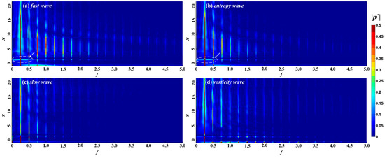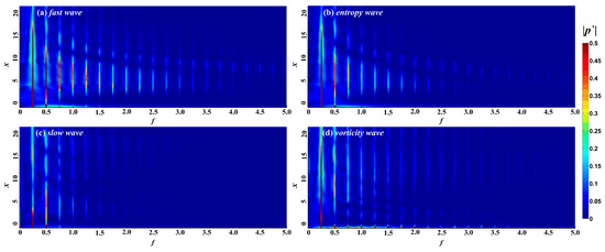 Figure 5 shows the spectrum of perturbations in the boundary layer under different free-stream conditions. Free-stream disturbances lead to the formation of perturbations with different modes in the boundary layer. Again, the non-dimensional frequency of the free-stream disturbances is 0.25, and the perturbations with frequencies of 0.25 and 0.50 in the boundary layer are respectively called fundamental mode, second harmonic mode, and so on. The fundamental and second harmonic modes in the boundary layer begin to appear in the nose region under free-stream disturbances, while any harmonic modes with higher frequencies appear at the edge of the nose region or even further downstream. The perturbations in the boundary layer are concentrated in the fundamental and harmonic modes, and the other frequencies account for a small proportion in the boundary layer. The frequency range of the perturbations in the boundary layer caused by fast waves, entropy waves, and vortical waves is wider, in the range 0 < f < 5. For perturbations in the boundary layer caused by fast and entropy waves, the higher the frequency in the boundary layer, the later the harmonic mode appears and the earlier it disappears. The spectral maps in the boundary layer caused by fast waves and entropy waves are similar. As the pressure fluctuations in the time domain in the instantaneous hypersonic unsteady flow field under fast waves and entropy waves are similar, we think that the hypersonic boundary layer receptivity under fast waves and entropy waves is similar, whereas the influence of fast waves on the hypersonic flow field and the boundary layer is stronger. For slow waves, the frequency of perturbations in the boundary layer is lower, in the range 0 < f < 2.5.