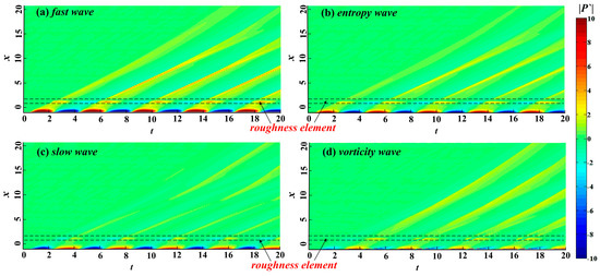 We reported above that free-stream disturbances obviously change the hypersonic boundary layer receptivity, and the evolution processes of the perturbations in the boundary layer under different types of free-stream disturbance are quite different. As another important factor affecting the hypersonic boundary layer receptivity, the wall condition also can affect the propagation of perturbations in the boundary layer. We discussed the impact of a roughness element on the evolution of perturbations in the boundary layer with entropy waves. We depicted the impact of roughness element height on the propagation of perturbations with different frequencies in the boundary layer [24]. Therefore, the response of a hypersonic flow field to free-stream disturbances with a roughness element is not analyzed here. Figure 9 shows the propagation process of wall pressure fluctuations in the spatial and time domains under different types of free-stream disturbance with a rough wall. In the spatial domain, when perturbations in the boundary layer encounter the roughness element, the wall pressure fluctuations are amplified. When the perturbations pass through the center of the element, pressure fluctuations begin to decrease until the downstream region of the roughness element. In the time domain, perturbations in the boundary layer are continuously affected in the roughness element region, and the wall pressure fluctuations are always amplified. Generally, the roughness element has a similar influence on perturbations in the boundary layer with different free-stream disturbances. The only difference is that the variation in the amplitude of the perturbations in the boundary layer has a certain influence. Among the four kinds of free-stream disturbances, the roughness element has the strongest amplification effect on the perturbations in the boundary layer caused by fast waves, followed by entropy waves, and the perturbations in the boundary layer caused by slow and vortical waves are the weakest.