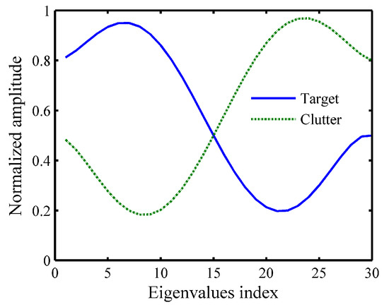 In this section, several numerical simulations are performed to demonstrate the performance of the proposed method. Assuming that the length of the transmitted waveform is , the initial waveform is generated by a random phase-coded signal. The length of TIR and CIR are . Meanwhile, both the target and clutter are mutually independent circular symmetric complex Gaussian random vector, i.e., , [28], where and . According to [5], and are normalized covariance matrix, where and have the same structure. Hence, taking the as an example, is a diagonal matrix and is the unitary discrete Fourier transform (DFT) matrix with its entry given by
