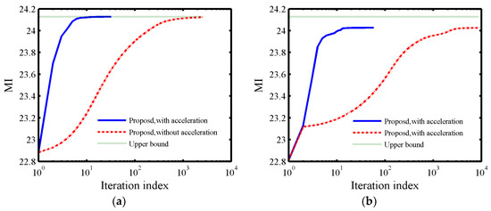 Let the total energy of waveform , and . Figure 3 shows the convergence of the proposed MM-based method. In addition, the upper bound is obtained by using the Lagrange multipliers method to solve under only the energy constraint. From Figure 3a ( which is equivalent to the energy constraint) and Figure 3b ( which is equivalent to the constant-modulus constraint), it can be seen that the accelerated case is much faster than the case without acceleration. Meanwhile, the MI of the synthesized waveform with can get the upper bound and the case with is about 0.07 away from the upper bound, this is because the large PAR value () has larger feasible set region than small PAR value ().