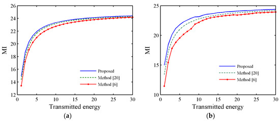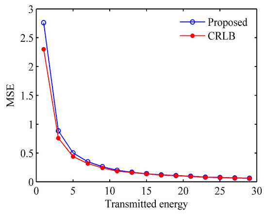 Figure 6 shows the performance assessment for the estimation of target with the proposed method. For the optimal waveform based on maximizing MI, mean squared error (MSE) will be used for performance assessment. In addition, we also compared with the CRLB. The MSE and CRLB for transmitted waveform are derived in Appendix A. From Figure 6 we can see that the estimated performance gets closer to the CRLB as the transmitted energy increases. So, it verifies that the waveform generated by the proposed method has good estimation performance.
