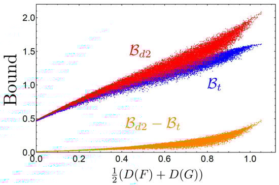 For the case of rank-1 PVMs, it has been verified that is stronger than because of the relation in Equation (17). To provide numerical examples illustrating that it is also the case for general POVMs, we compare with for randomly generated doubly stochastic matrices in Figure 2. To clearly show their difference, we also exhibit the difference . We plot these values versus the degree of unsharpness quantified by so-called device uncertainty [,], , and likewise for . We see that gives better bounds than , as illustrated by the difference being positive in all cases. The gap tends to be larger as the degree of unsharpness increases. This result provides evidence that provides a stronger bound than as expected.