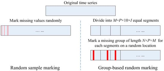 Random sample marking: In this scheme, the missing points are randomly marked in the time series. First, the count of missing values to be marked C is calculated in accordance with the specified missing percentage P multiplied by the total number N (C = P × N). Then, C positions are selected randomly from the original time series without replacement. Finally, each value on these positions is replaced by a special identifier (NA, for example, is commonly used in R) to indicate the missing values.