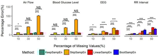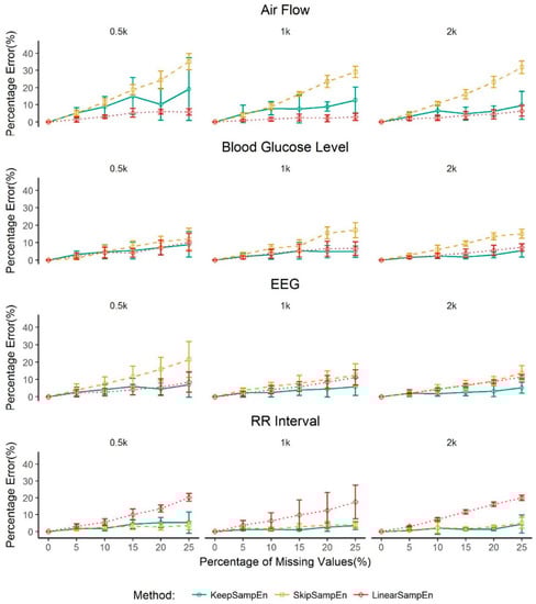 It worth noting that LinearSampEn achieved a low percentage error, similar to KeepSampEn, when the missing values were generated randomly. However, it has a much higher percentage errors when the missing values are grouped together (red lines in Figure 6).