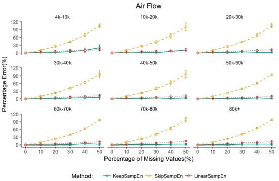 To investigate whether the KeepSampEn method is robust to data size (i.e., the length of the time series in a study), we first applied our method to nine datasets with a large size (4k–10k, 10k–20k, 20k–30k, 30k–40k, 40k–50k, 50k–60k, 60k–70k, 70k–80k, 80k+, where 1k represents 1000 data points) from the air flow dataset. For each data size, we selected three time series randomly for analysis. The performance is shown Figure 4. The result shows that, among the four methods of handling missing values, our method KeepSampEn obtains the smallest percentage error rate almost in any data size. The result further shows that KeepSampEn can effectively control the percentage error below 4.53% regardless of the amount of data when the percentage of missing value is less than 30%. When the percentage of missing value is above 30% but less than 50%, the percentage error can be greater than 5% but within 15%.