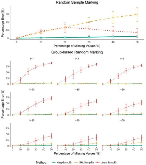 In actual practice, many situations lead to missing values. We consider two common situations: a single missing point and a group of missing points at a time. An example of the first situation is that outliers [20,30] must be identified and excluded in heartbeat signals before calculating sample entropy. A common example of the second situation is a disruption in the wireless or network transmission of data which may cause a group of missing values [31,32].