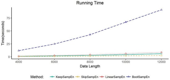 We evaluate the computational complexity by calculating running time of four methods on the data with the same length (time complexity). The time for calculating sample entropy based on the time series without any missing value has O(n2). For convenience, we denote this running time as the base so that the running time of all the four methods for handling missing values can be compared with it. SkipSampEn takes slightly less time than the base due to the reduction of the number of points. KeepSampEn takes almost the same time as the base. LinearSampEn takes slightly more time than the base due to additional interpolation operations. BootSampEn takes 10 times as much time as the base because it includes resampling and averaging 10 times. We further use a list of air flow data for verification. The result shown in Figure 7 confirms the theoretical derivation.