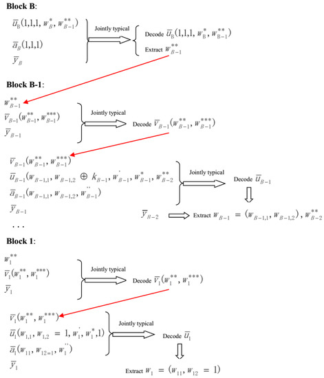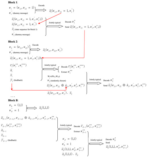 - The overall message W is composed of B components (), and each component () is the message transmitted in block b. The value of belongs to the set . Next, split into two parts , and the values of and , respectively, belong to the sets and . Note that .