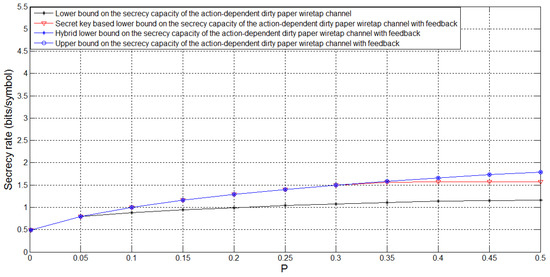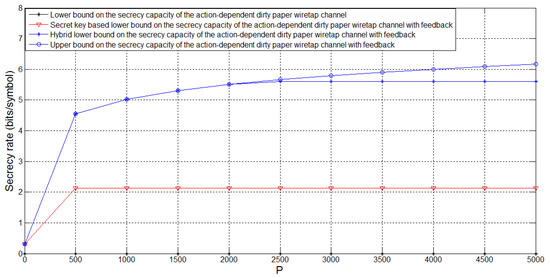 Figure 5 depicts the bounds on and the lower bound on the secrecy capacity of the action-dependent dirty paper wiretap channel for , , , and several values of P. For this case, we see that there is no positive achievable secrecy rate of the action-dependent dirty paper wiretap channel, and feedback enhances . Moreover, we see that the hybrid feedback scheme performs better than the secret key based feedback scheme, and there exists a gap between the lower and upper bounds on when P is sufficiently large.