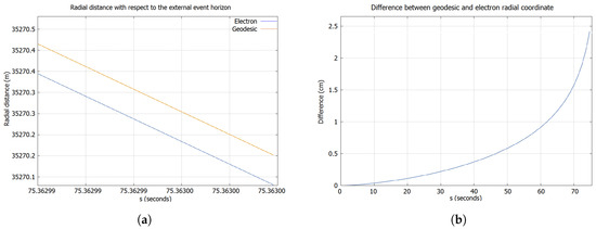 For this numerical computation, we have considered a BH with 24 solar masses and , with the electron located outside the external event horizon in the plane. We have assumed an electron with a radial velocity of 0.9 and a initial spin aligned in the direction. (a) Trajectory at 35 km of the event horizon; (b) Relative position between the two particles.