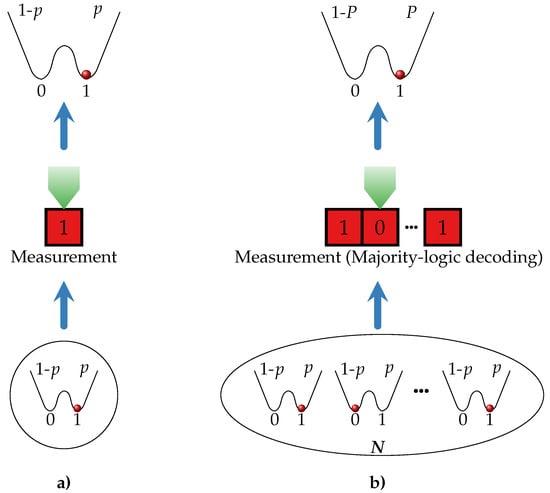 As an elementary storage unit, we consider a microscopic binary unit with states 0 and 1 and denote by p the probability to observe it in state 1. Based on these microscopic binary units we can construct macroscopic (logical) bits in two different ways as illustrated in Figure 1. First, we consider a single-unit bit (SUB) in Figure 1a that consists of only one microscopic unit and is in contact with a heat bath at inverse temperature . The probability of finding the SUB in state 1 is represented by P, and is, of course, equal to probability p for the microscopic unit to be in state 1. Alternatively, a majority-logic decoding bit (MLB) can be thought of as an array of N identical and non-interacting microscopic units that are subjected to the same experimental protocol and connected to a heat bath at inverse temperature as sketched in Figure 1b. The probability of the MLB to be in state 1 is denoted by P and is determined via majority-logic decoding. This decoding scheme prescribes that the information encoded in the MLB corresponds to the state that is occupied most at the level of the microscopic units and is therefore a coarse-graining procedure that is mathematically formulated in the following.