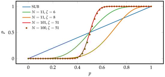 First, we observe that the macroscopic probability P is monotonically increasing with p. Next, for any value of N and it holds for that since the complete beta function becomes a unity operator, . Physically, this means that perfect information erasure in an MLB () is realized by perfect erasure in each microscopic unit the MLB consists of. For odd values of N the symmetric case, , corresponds to the majority-logic decoding in the strict sense, that is