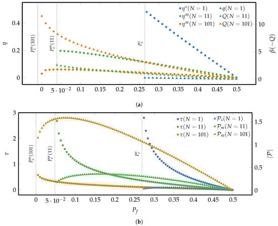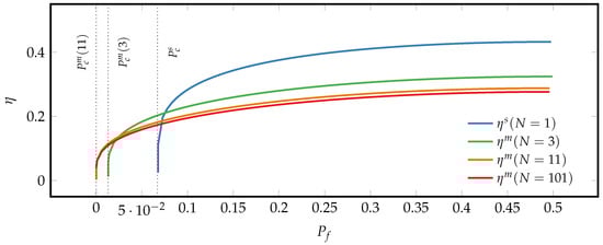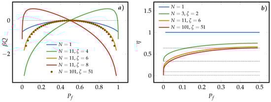 The erasure efficiency of MLBs under symmetric majority-logic decoding, , for different array lengths N is shown in Figure 3b. Consistently to the observations made in panel (b), the SUB is always more efficient than the MLB whose erasure efficiency decreases as N increases. The same applies to the other erasure branch given by that can be seen as follows: According to Equations (5) and (9), the macroscopic Shannon entropy of a symmetric MLB is symmetric with respect to . Therefore, the energetics of the erasure process from the initial state to the final state is the same as that of the erasure process from to the final state . Hence, we will restrict to the symmetric majority-logic decoding characterized by Equation (5) and to the erasure branch, , in the following. To ease notation, we omit the explicit notation and .