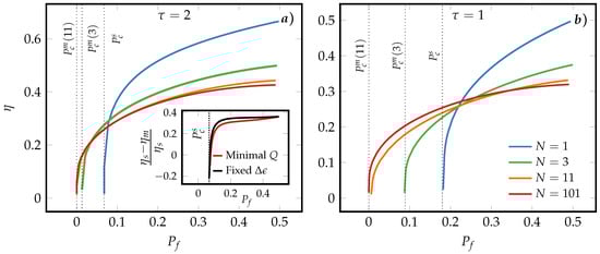 As can be seen in panel (a), to perform an erasure with the same erasure error the SUB dissipates less heat and thus has a higher efficiency than the symmetric MLBs, for which the heat production increases and the efficiency decreases with growing N. Hence the SUB is more efficient than the symmetric majority-logic decoding, as already observed in the reversible case, cf. Figure 3. However, Figure 4b shows that the erasure duration is reduced, and the erasure power thus enhanced by employing the majority-logic decoding for large ensembles of microscopic units. The minimal erasure error characterized by Equation (36) is indicated by the dotted vertical lines that correspond to the minimal final probability . Therefore, as already derived in Equation (29), majority-logic decoding reduces the minimal erasure error that goes to zero as N becomes large corresponding to perfect erasure.